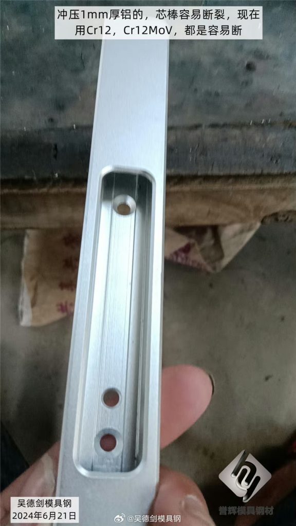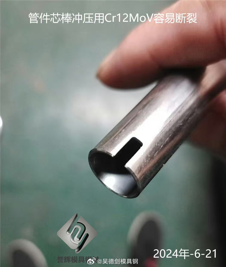 陈老板的管件芯棒断裂问题,被高韧性的LG模具钢,根治了。原来芯棒用Cr12MoV、SKD11、DC53,都试过了,都是冲几百一千个就断裂,没法干,现在改用高韧性LG模具钢,冲压3万多件也没断。