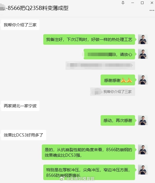 是的,从抗崩裂性能的角度来看,8566防崩钢的效果确实比DC53强,特别是在厚板冲压,尖角冲压,窄边冲压方面,8566防崩钢更擅长。吴德剑8566,70%是老客户复购以及客户转介绍,好产品,很多人都会分享给周围的朋友使用,吴德剑模具钢,用户的参谋长,用过的都买账。