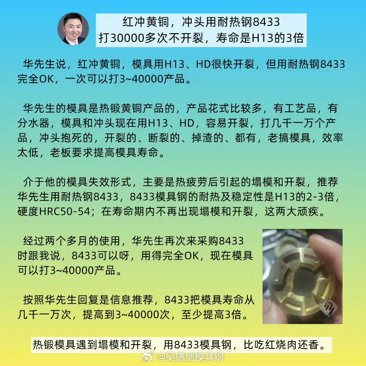 华先生说,红冲黄铜,模具用H13、HD很快开裂,但用耐热钢8433,完全OK,一次可以打3~40000产品,模具寿命是H13的3倍。