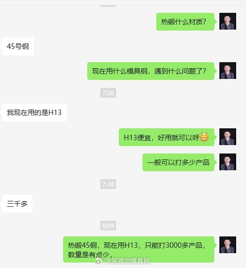 上班路上收到山东伍先生咨询,热锻45钢,现在用H13模具钢,可以打3000多次。