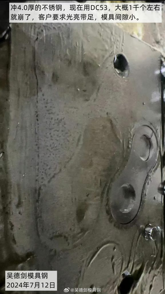 下午上班,收到何先生咨询,冲4.0厚的不锈钢,现在用DC53,大概冲1千个左右就崩了,客户要求光亮带足,模具间隙小。