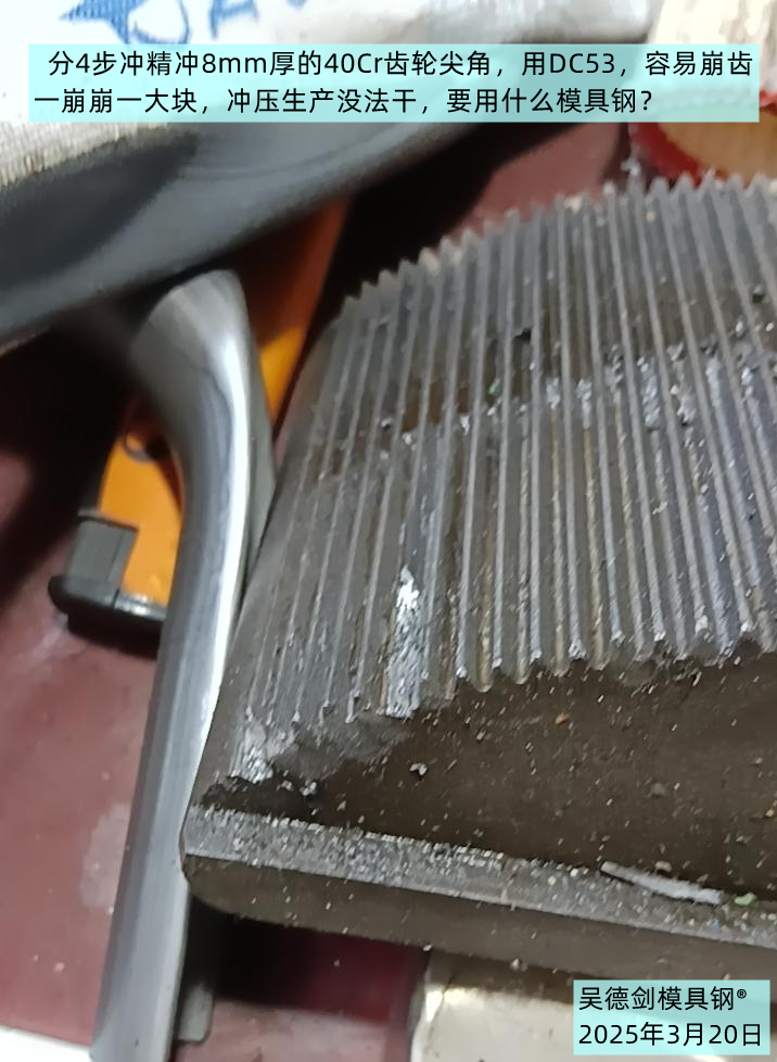 今天收到一个咨询,我挺唏嘘的。谭先生说,他精冲8mm的40Cr材质的齿轮尖角,现在模具是分四步精冲的,用Cr12MoV的时候,压一个产品就爆裂了,现在用DC53,一崩崩一大块,问精冲模具要用什么模具钢?
