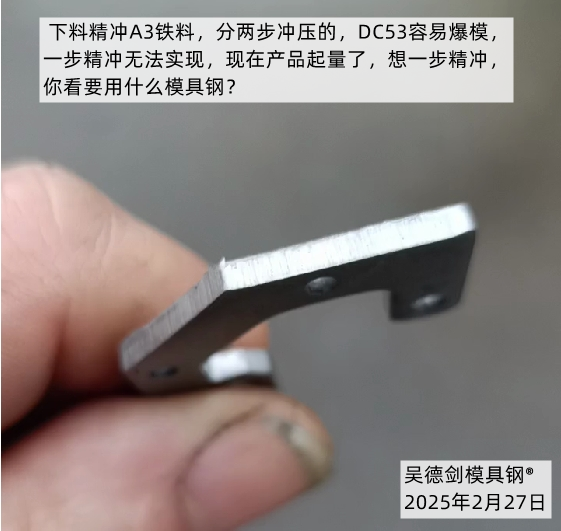 这让我想起了前段时间来找我们的一位客户,他是精冲A3铁料的,模具用DC53的时候,一步精冲的时候要爆裂,模具干不了,间隙太小了,模具直接就压爆掉了,现在是分开两步下料精冲的,但是效率低下,而且产品报废率高,因为工人稍微一下没注意,产品没放到位,压出来的产品就报废了,如果是产品或模具上面粘上一点点脏东西,你压下去光亮带也不好了,产品也是报废了,现在效率太低,报废率高,原来没有什么产量还没所谓,现在产品起量了,我要买8566模具钢来做,一步精冲。