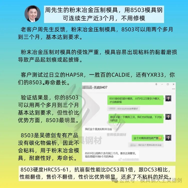 但周先生的粉末冶金模具用8503模具钢,生产3个月不用修模,对比一胜百的CALDIE,日立的YXR33、HAP5R,8503模具钢的寿命最长,价格最便宜。
