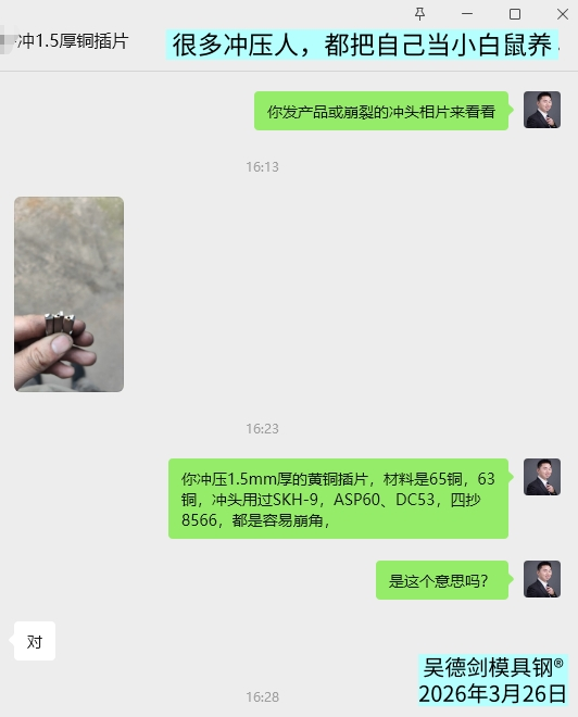 还有第三位用户,他是冲压62铜的黄铜插片,材质有65铜、62铜,厚度有1.5mm,他有个冲头也是干不了多少产品就会崩,半天都干不到。DC53、SKH-9、ASP60、四抄8566、 四抄LG、都用过了,都是容易崩,没办法解决。找到我之后,我还是推荐他用8566防崩钢。因为做铜插片的,我们已经有成功案例了。
