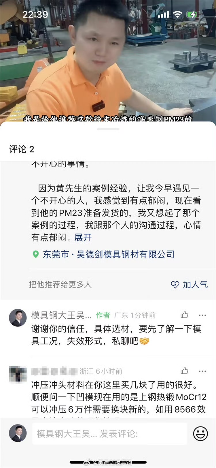 吴德剑已经解决了800多个客户的模具钢问题,并拍成了视频