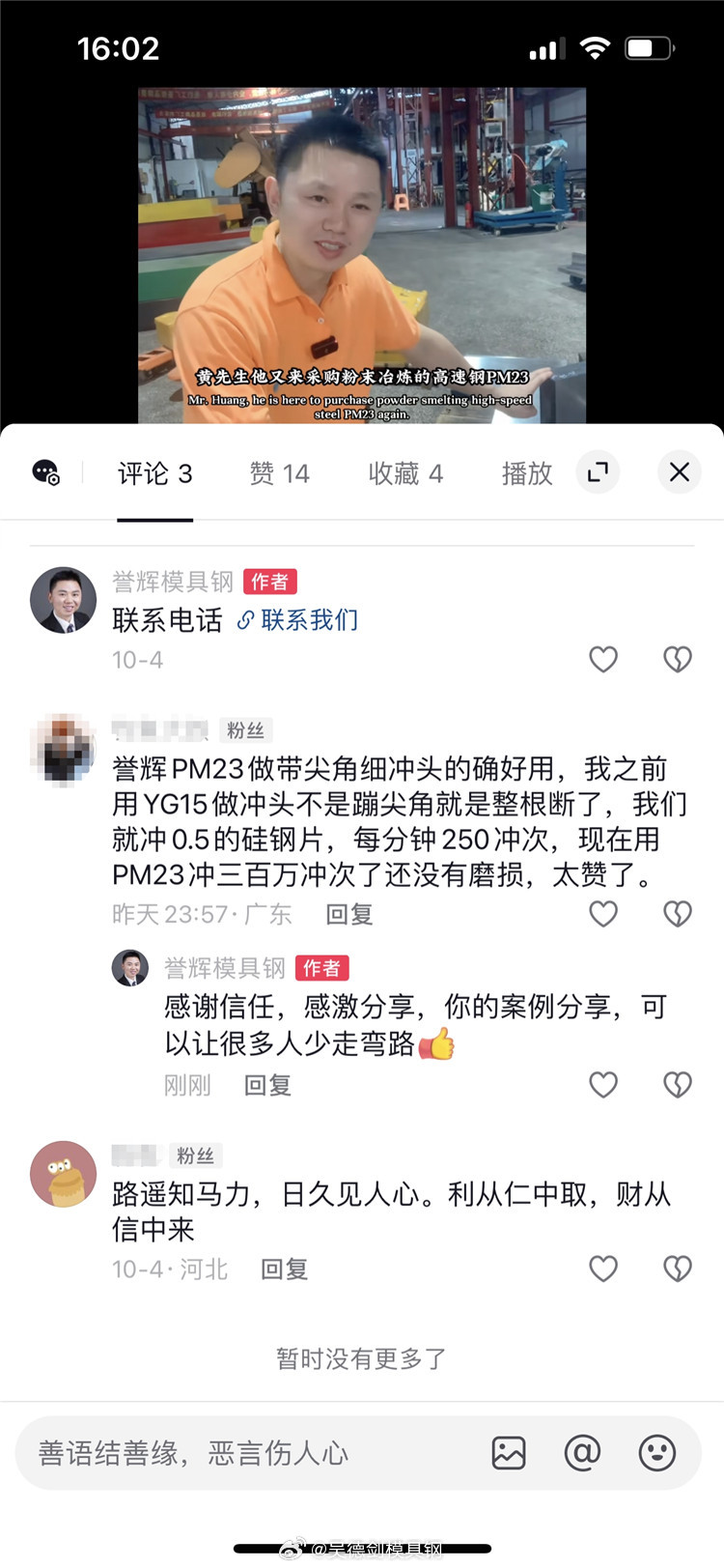 誉辉 PM23做带尖角细冲头的确好用,我之前用 YG15做冲头,不是蹦尖角,就是整根断了,冲 0.5的硅钢片,每分钟250冲次,现在用PM23冲300万冲次了,还没有损,太赞了。