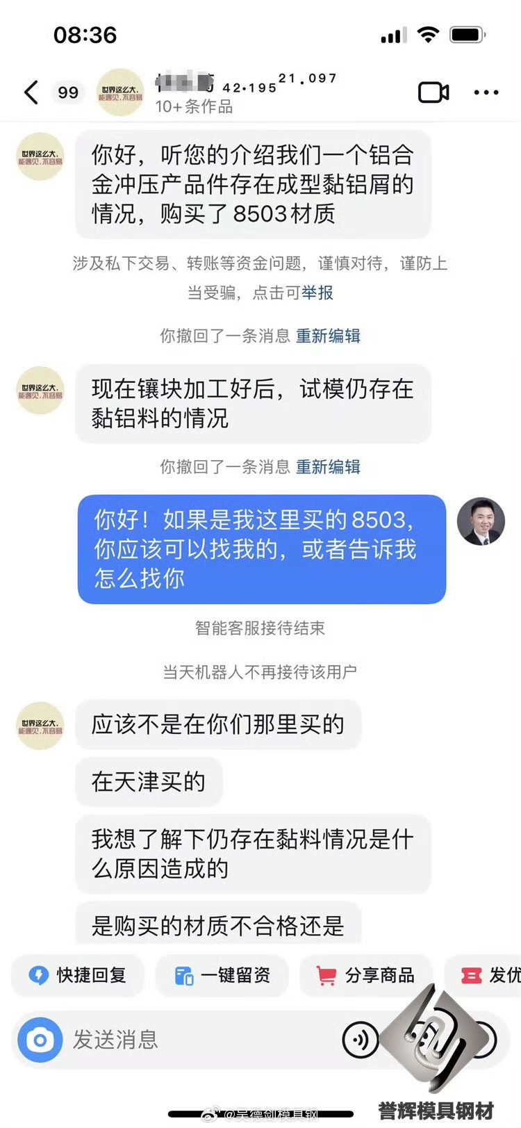 冲压铝材容易粘铝粉,这是行业顽疾,但不粘料的8503模具钢冲压铝料,确实是不粘铝粉的,这是客户验证的结果。周老板惊呼,“冲铝用8503模具钢,真的不粘料”。