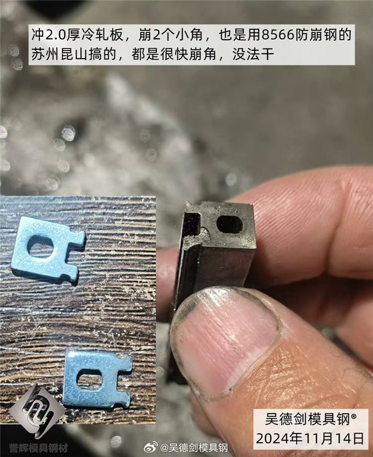 蒙先生冲压2.5厚高强度钢R1的尖角,其他模具钢都要崩角,修模赶不上冲头崩裂速度,但用上8566防崩钢后,冲头崩裂问题就解决了,模具也顺畅了,生产得以顺利进行。