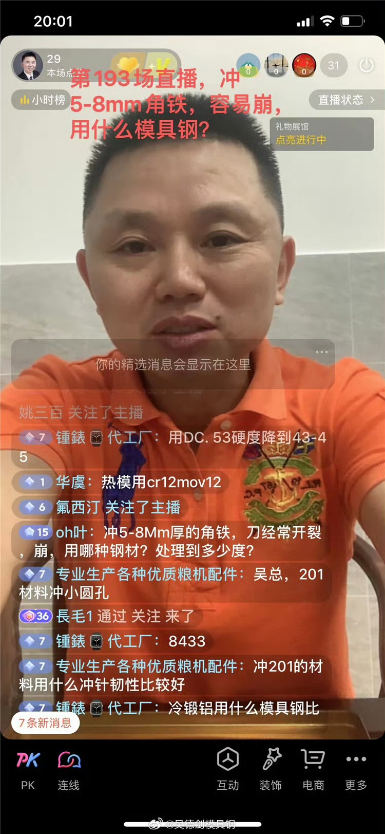 直播间网友提问:冲5-8mm厚的角铁,刀经常开裂、崩,用哪种钢材,处理到多少度?