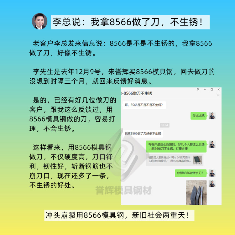 8566模具钢的抗崩裂性能是高速钢SKH-9的4倍,D2的2倍,硬度HRC58-60,客户验证,榔头敲变形也不碎裂,它能解决D2、DC53、SKH-9等高硬度模具钢无法解决的崩裂问题,高强度高韧性的8566防崩钢,不应该仅仅局限于模具上面使用。