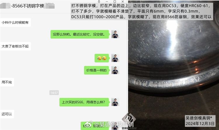 史先生上次找到我之后,推荐他用8566防崩钢,字模用8566防崩钢,效果肯定比DC53好。