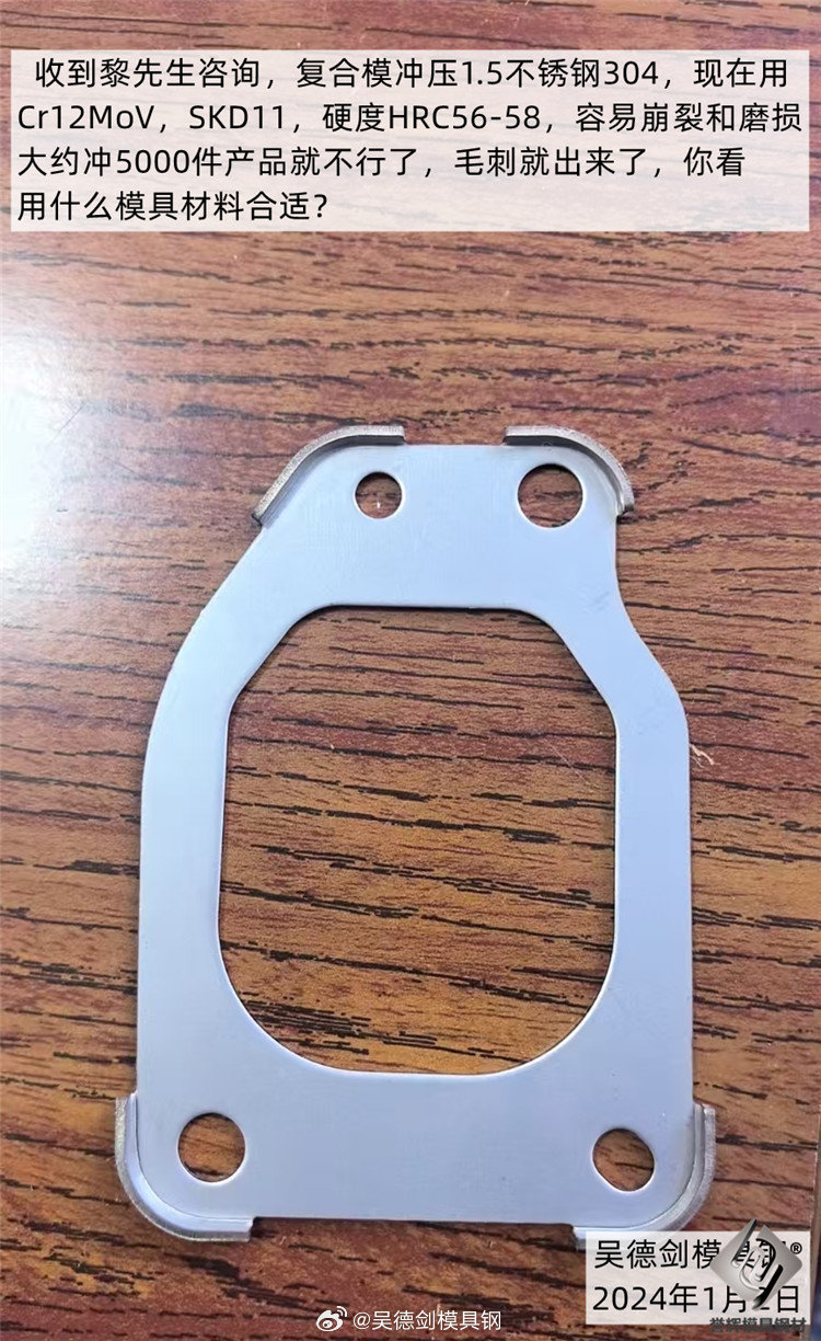 细聊后得知,是复合模落料、成型、冲孔,被冲材是1.5和2.0的304不锈钢,一开始是用Cr12MoV,后来用SKD11,还是不行,改善不大,有磨损有崩裂,模具硬度HRC56-58,都是冲5000件左右就出毛刺,想延长模具寿命。