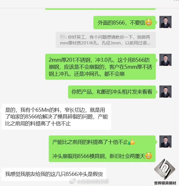 李先生立马回复说,是的,我有个65Mn的料,窄长切边,就是用了咱家的8566给解决了模具碎裂的问题,产能比之前用的料提高了十倍不止。