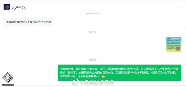 但用吴德剑PM4粉末高速钢,冲压50万次也不磨损,寿命提高5倍。因为PM4粉末高速钢确实好用,黄老板还帮我们介绍他的同行来买PM4。