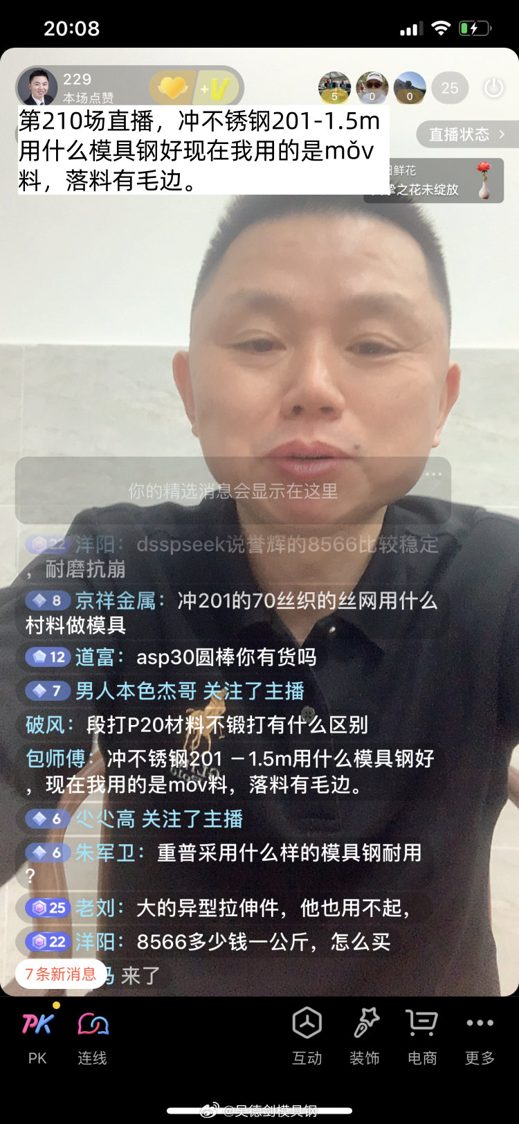 包师傅在直播提问,冲不锈钢201-1.5mm用什么模具钢好?现在我用的是Cr12MoV料,落料有毛边。