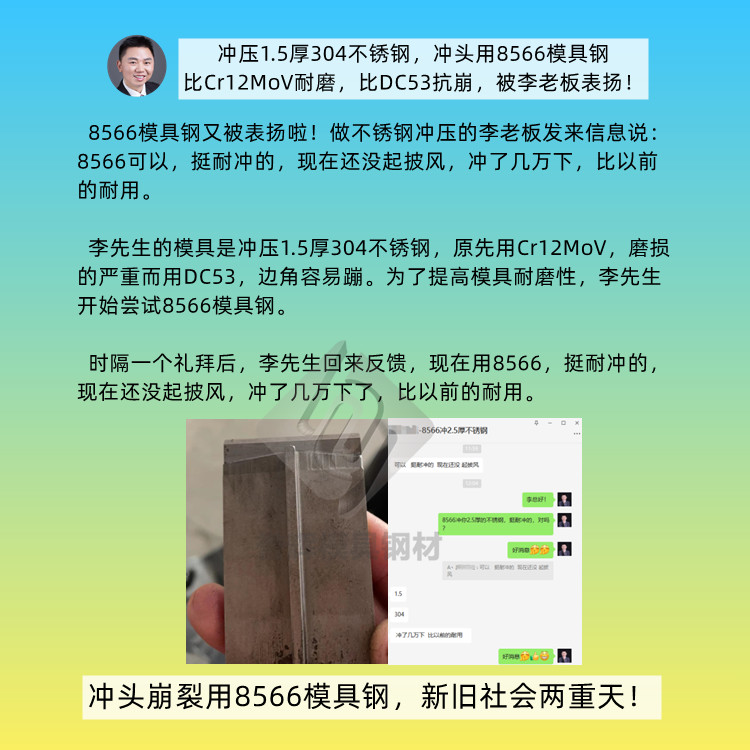 李先生冲压1.5mm304不锈钢,原先用Cr12MoV,损的严重,而用DC53,边角容易蹦。为了提高具耐性,李先生开始尝试8566模具钢。