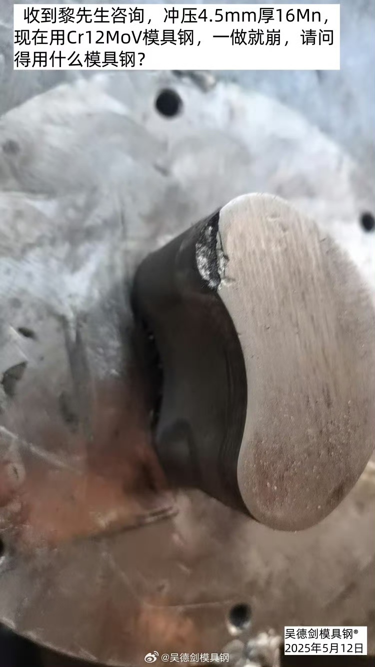 黎先生冲压4.5mm厚16Mn合金钢,Cr12MoV一做就崩,一崩崩一大块的,我推荐8566防崩钢。冲头崩裂用8566模具钢,新旧社会两重天。