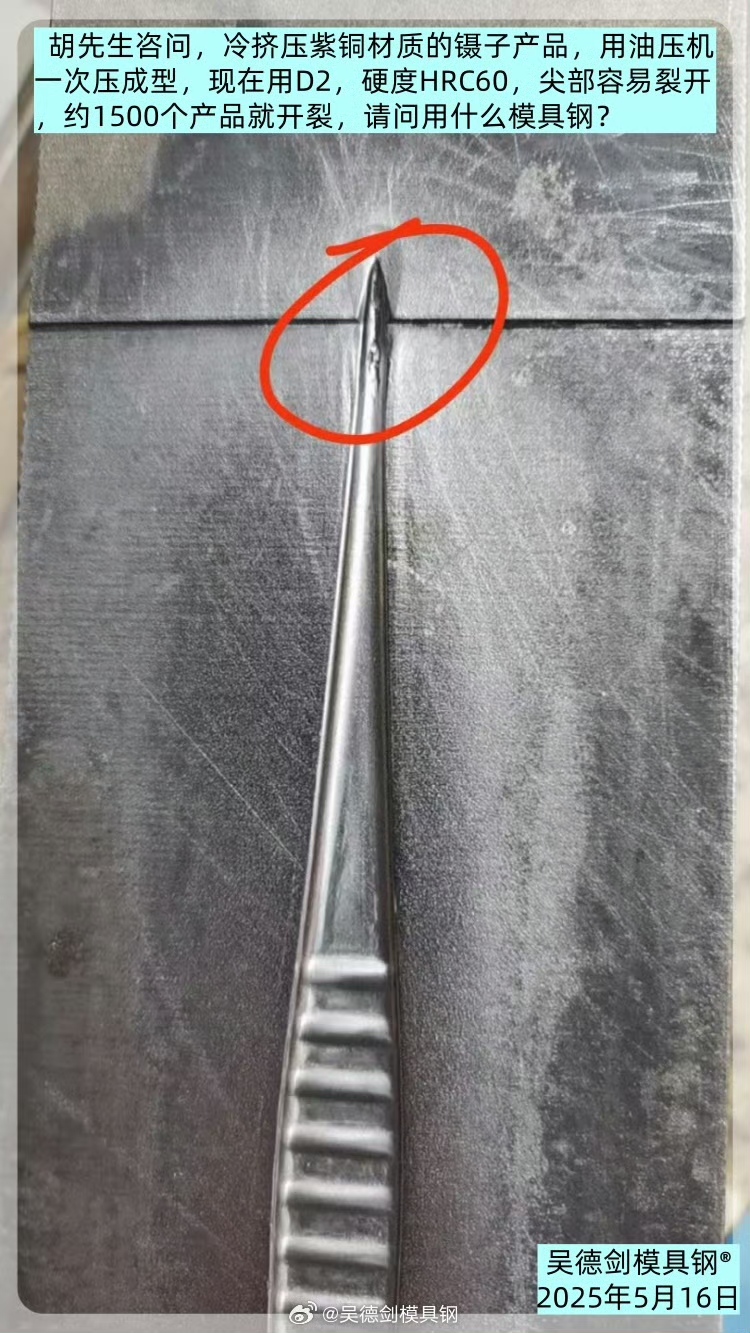 胡先生是用油压机一次压成型冷挤压紫铜材质的镊子产品,现在用D2,硬度HRC60,尖部容易裂开和粘铜粉,约1500个产品就开裂,请问用什么模具钢?