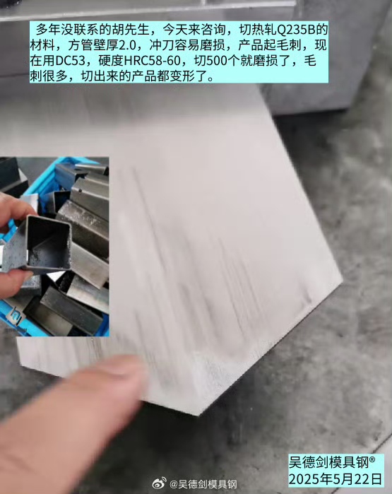 第二位是多年没联系的胡先生,今天来咨询,切热轧Q235B的材料,方管壁厚2.0,冲刀容易磨损,产品起毛刺,现在用DC53,硬度HRC58-60,切500个就磨损了,毛刺很多,切出来的产品都变形了。