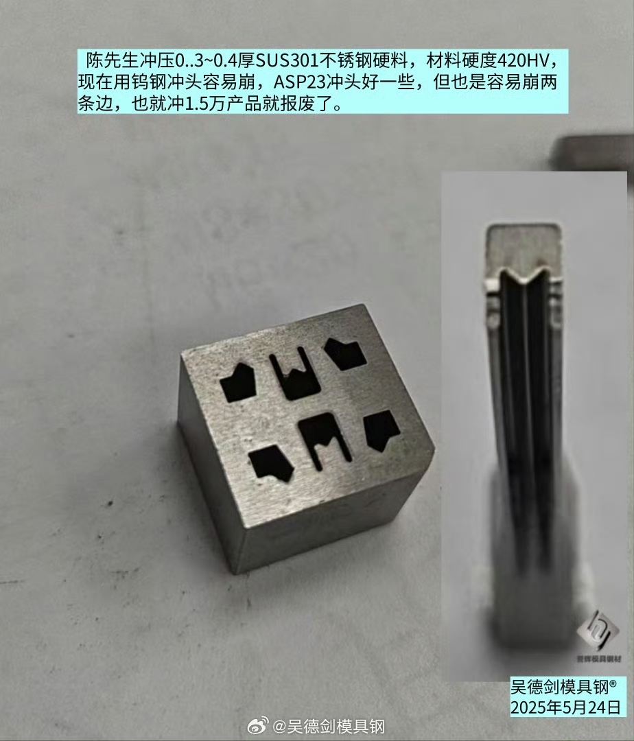 陈先生是2月份找到我们的,当时也是屁股冒烟是事情,急得要死。它是冲压0..3~0.4厚SUS301不锈钢硬料,材料硬度420HV,用钨钢冲头容易崩裂,ASP23冲头好一些,但也是容易崩两条边,也就冲1.5万产品就报废了。老修冲头,老线割,实在费事,所以来找我。