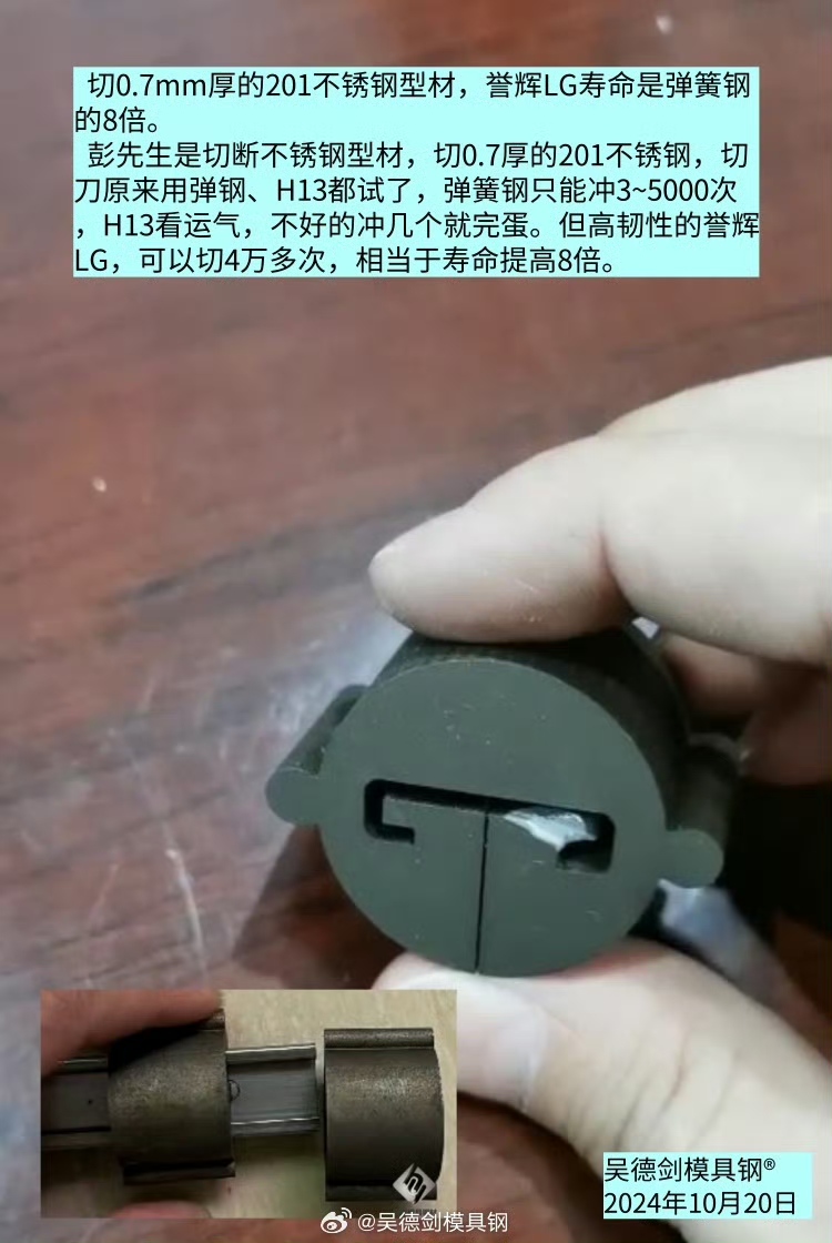 彭先生是切断不锈钢型材,切0.7厚的201不锈钢,切刀原来用弹钢、H13都试了,弹簧钢只能冲3~5000次就会断,H13看运气,不好的冲几个就完蛋。但高韧性的誉辉LG,可以切4万多次,相当于寿命提高8倍。