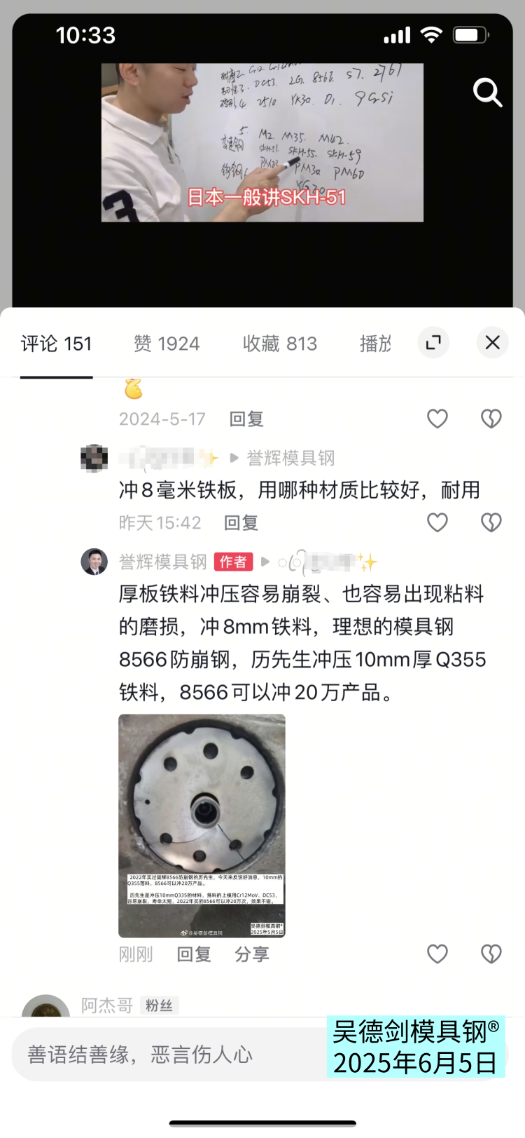 网友在我视频下面留言问,冲8毫米铁板,用哪种材质比较好,耐用。