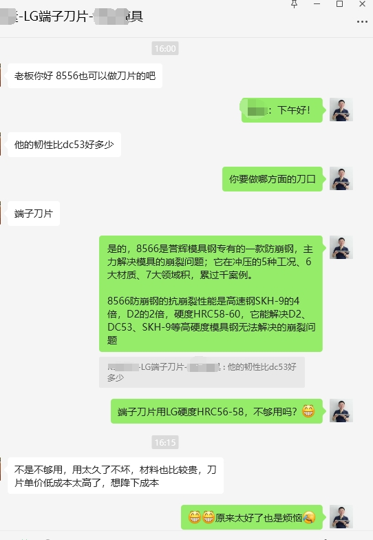 闫先生说,我做端子刀片,江苏买的60块钱一公斤的四抄LG,硬度HRC56,容易开裂,你的LG多少钱一公斤?