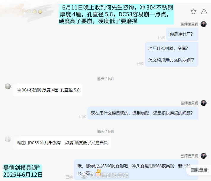 昨晚10点左右,收到何先生咨询,冲304不锈钢厚度4厘,孔直径 5.6,DC53容易崩一点点,硬度高了要崩,硬度低了要磨损,冲针要用什么模具钢?
