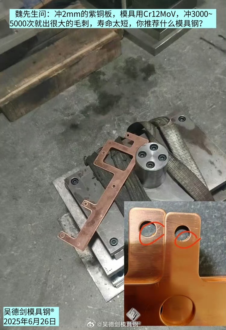 魏先生问:冲2mm的紫铜板,一套模具冲3000~5000次就出很大的毛刺,寿命太低,你推荐什么模具钢?现在模具用Cr12MoV的。