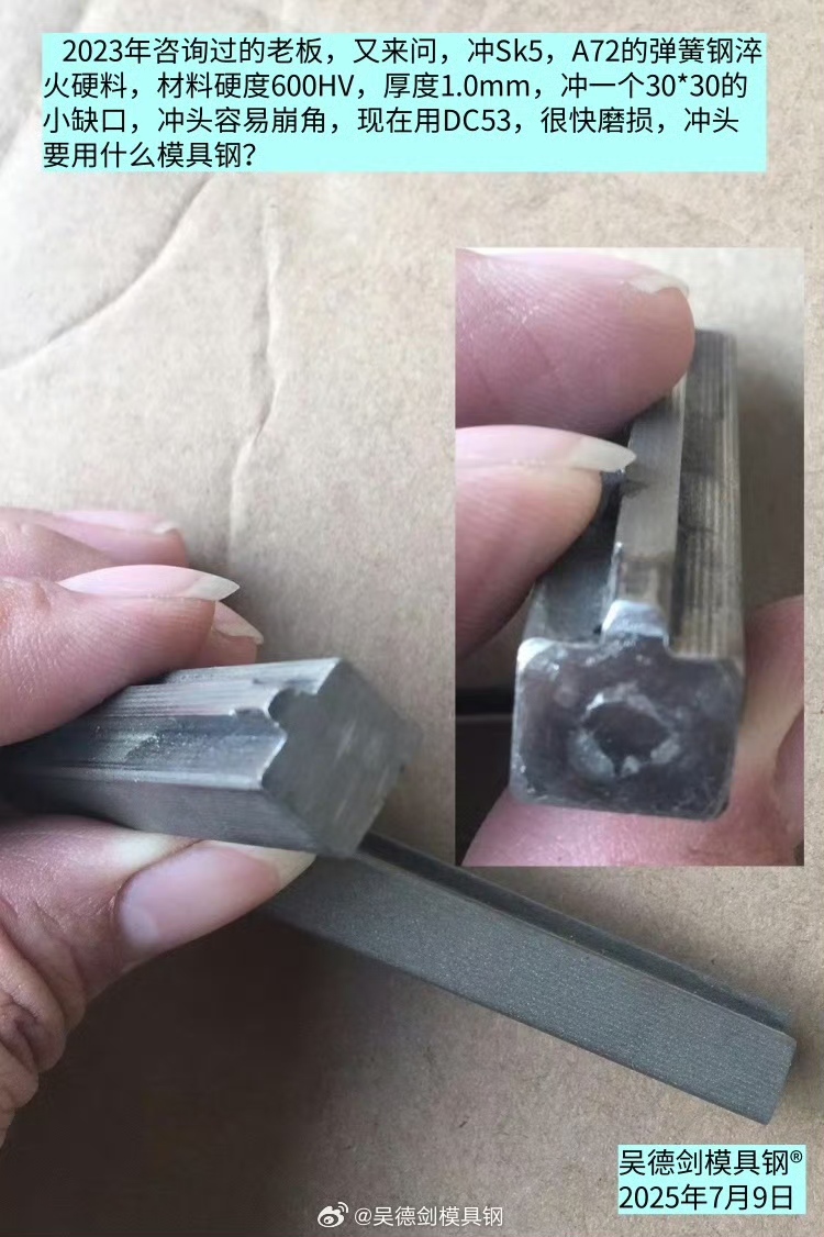 2023年咨询过的老板,又来问,冲Sk5,A72的弹簧钢淬火硬料,材料硬度600HV,厚度1.0mm,冲一个30*30的小缺口,冲头容易崩角,现在用DC53,很快磨损,冲头要用什么模具钢?