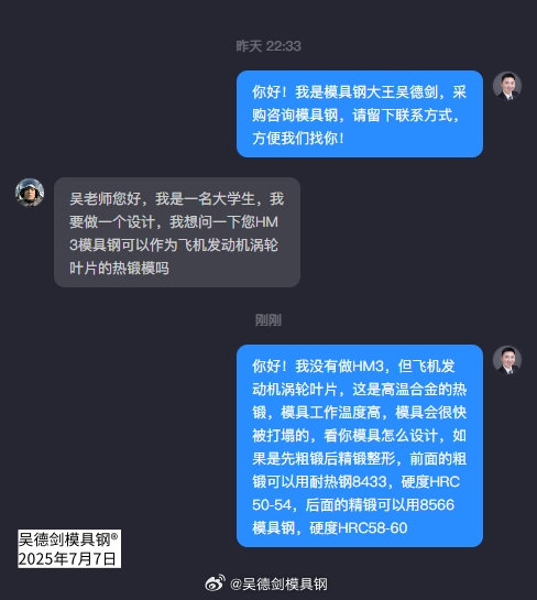 大学生留言问:HM3模具钢可以作为飞机发动机涡轮叶片的热锻模吗?