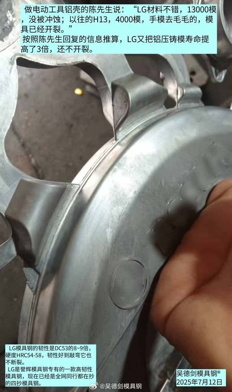 今早收到好消息,做电动工具铝壳的陈先生说:“LG材料不错,13000模,没被冲蚀;以往的H13,4000模,手模去毛毛的,模具已经开裂。”