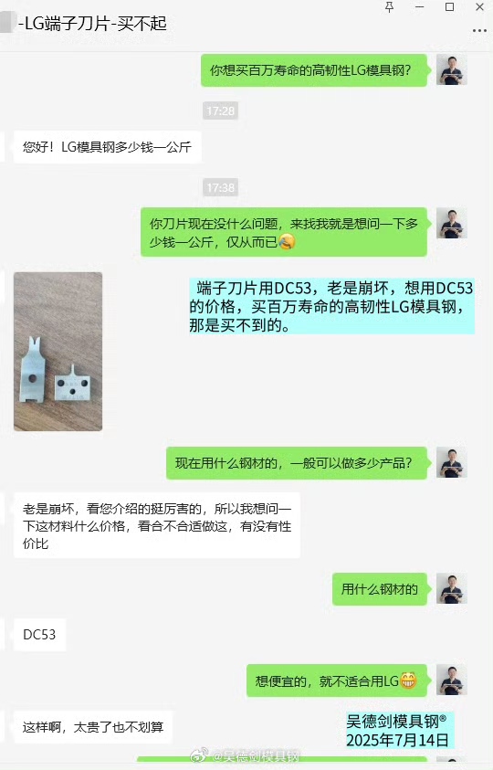 有人用DC53做端子刀片,老是崩坏,听介绍很厉害,想问一下多少钱一公斤,看看有没有性价比。