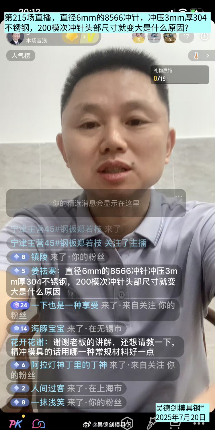 网友姜祛寒直播提问,直径6mm的8566冲针,冲压3mm厚304不锈钢,200模次冲针头部尺寸就变大是什么原因?
