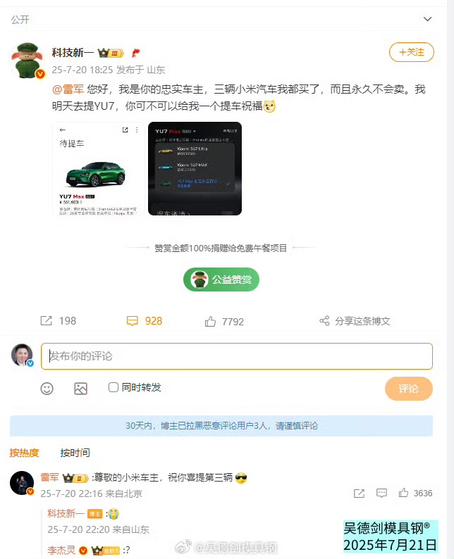 买了小米汽车,可以跟雷军要祝福,而且他还不得不祝福,这就是买互联网产品的好处,我们和雷军就在一个网上,我们能找到他。