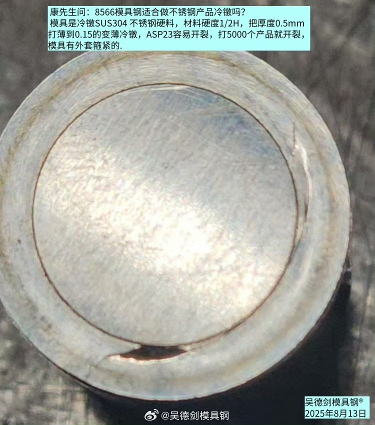 康先生把0.5mm厚的304不锈钢1/2H硬的材料冷镦变薄到0.15mm,现在用ASP23容易开裂,打5000个产品就开裂的,根据模具对性能的需求,以及现在的用料,失效形式,综合考虑,我推荐你用8566防崩钢。