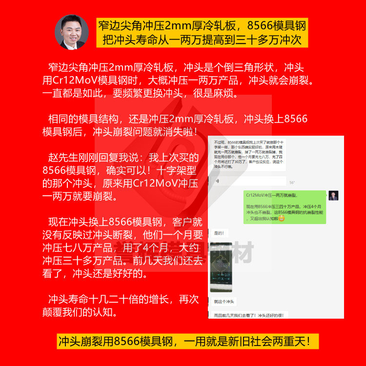 赵先生冲压2mm厚冷板,有个倒三角的窄边冲头,原来用Cr12MoV,冲1~2万产品就会崩角,老换冲头,生产不好干。但冲头换上8566防崩钢后,累计出货30万产品,冲头还是好好的,相当于冲头寿命提高了10多倍,新旧社会两重天。