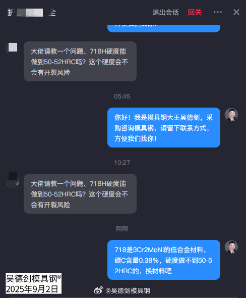 网友私信问:大佬请教一个问题、718H硬度能做到50-52HRC吗?这个硬度会不会有开裂风险。