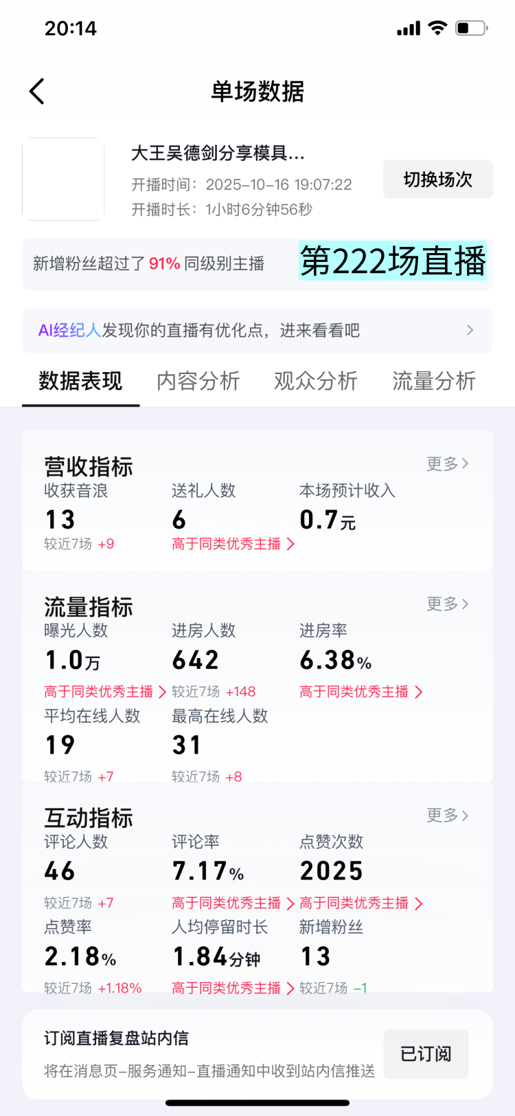 昨晚2025年10月16日,我做了1小时的直播,这是我的第222场直播。