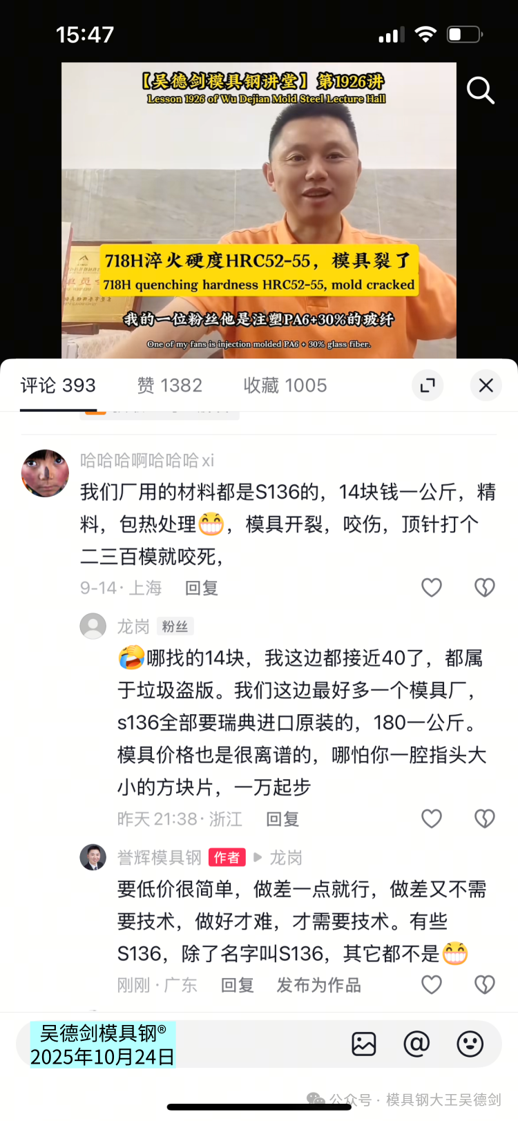 网友在视频下面评论说:我们厂用的材料都是S136的,14块钱一公斤,精料,包热处理,模具开裂,咬伤,顶针打个二三百模就咬死。
