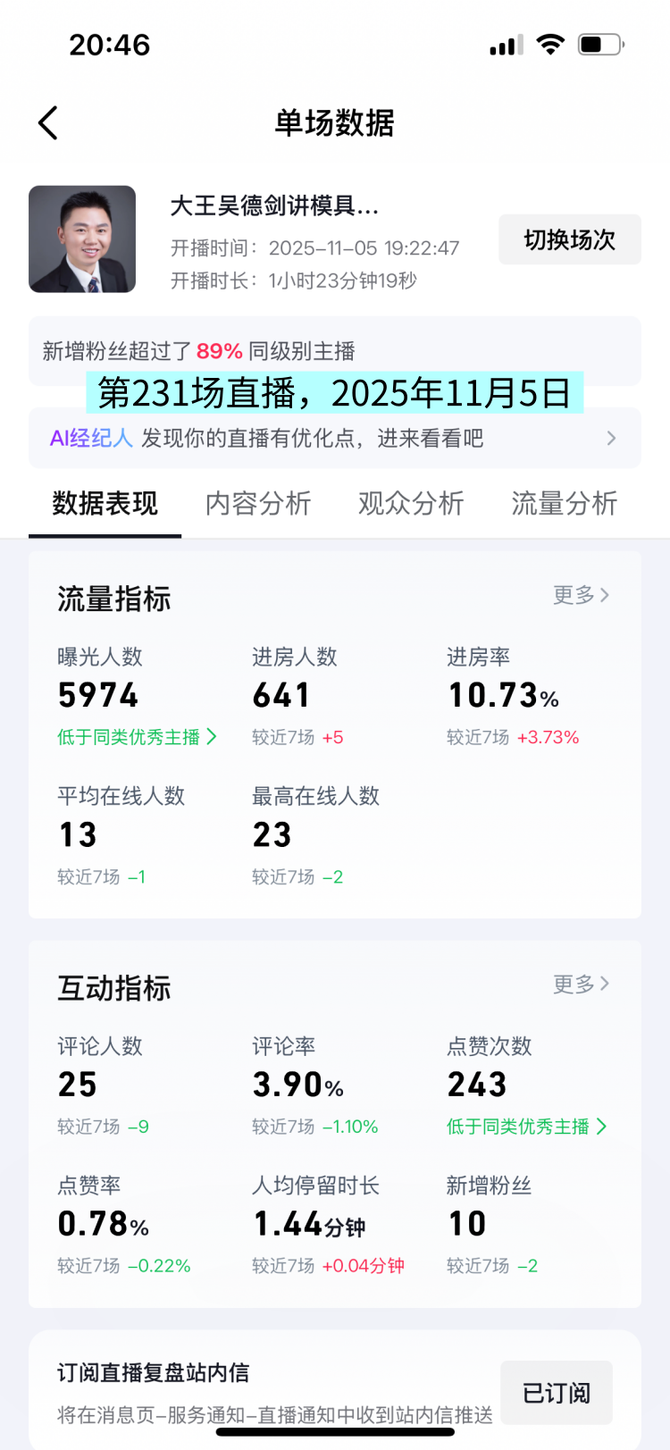 昨天的11月5日,我做了1小时直播,这是我第231场直播。