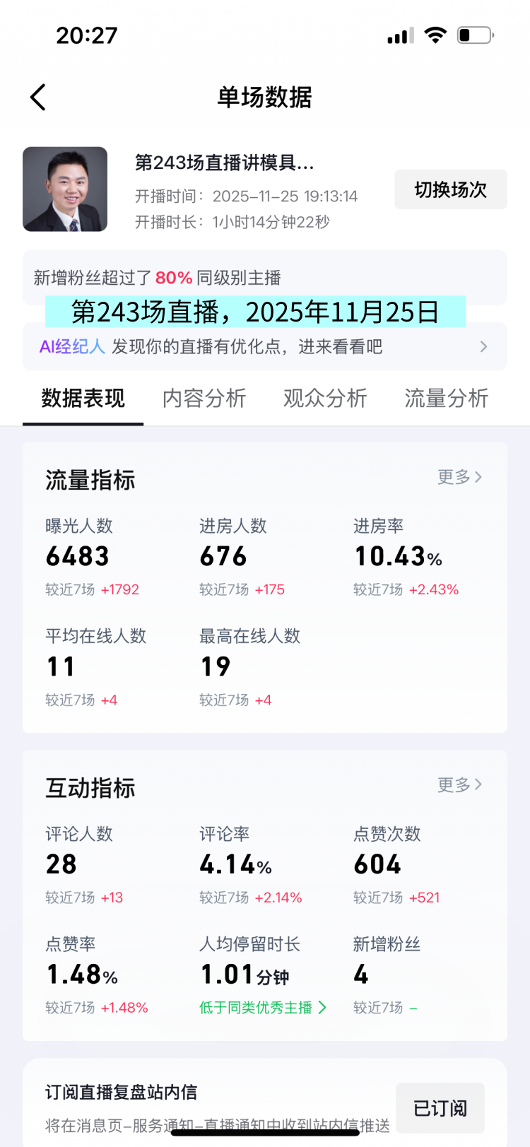 这场直播间的曝光人数6483人次,观众人数676人,人均观看时长1.01分钟,这场直播数据,较上一场有所提升,这是好现象。