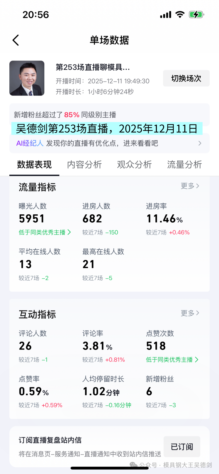 这场直播间的曝光人数5951人,观众682人,人均观看时长1.02分钟,这场直播数据和上一场差不多。