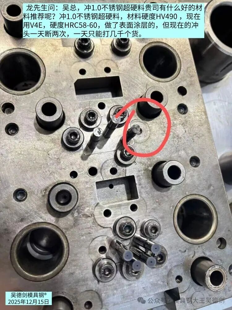 细聊后得知, 冲1.0不锈钢超硬料,材料硬度HV490 ,现在用V4E,硬度HRC58-60,做了表面涂层的,但现在的冲头一天断两次,一天只能打几千个货。
