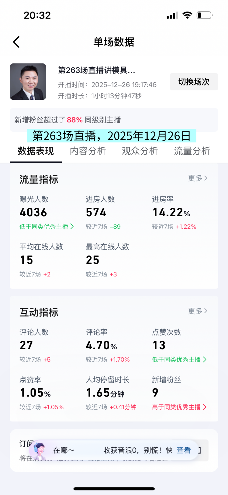 这场直播间的曝光人数4036人,观众574人,人均观看时长1.65分钟,平均在线人数15人,数据较上一场有进步,重回正常,心情好多了。