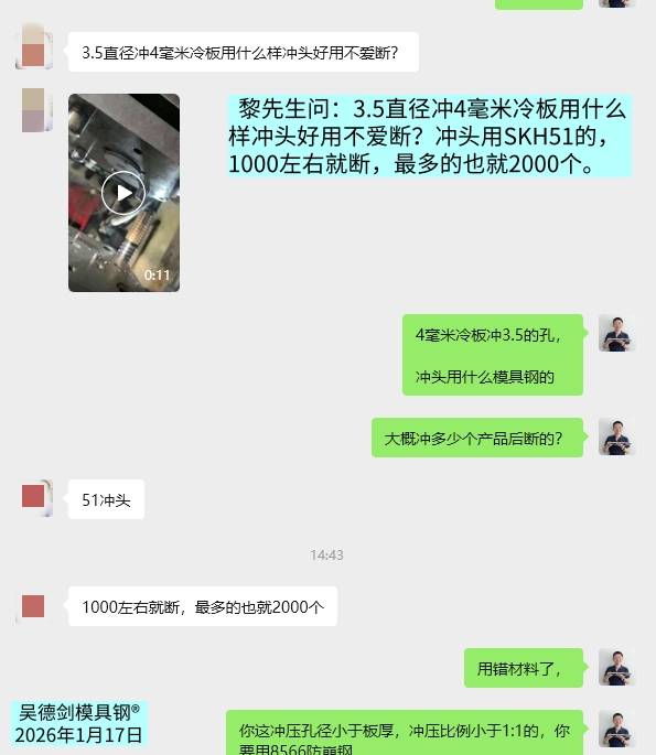 黎先生问:3.5直径冲4毫米冷板用什么样冲头好用不爱断?冲头用SKH51的,1000左右就断,最多的也就2000个。