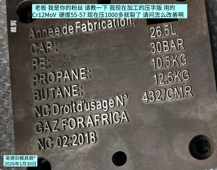 网友留言问:老板,我是你的粉丝,请教一下,我现在加工的压字版,用的Cr12MoV, 硬度55-57,现在压1000多就裂了,请问怎么改善啊?