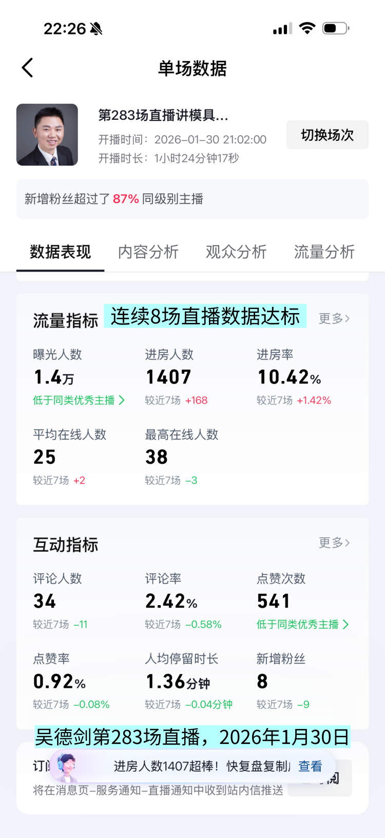 这场直播间的曝光人数1.4万,观众1407人,人均观看时长1.36分钟,平均在线人数25人,最高在线人数38人。连续8场直播数据达标,数据一直被刷新,挺好的。