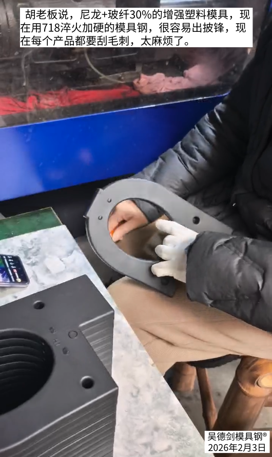 胡老板说,尼龙+玻纤30%的增强塑料模具,现在用718淬火加硬的模具钢,很容易出披锋,现在每个产品都要刮毛刺,太麻烦了。